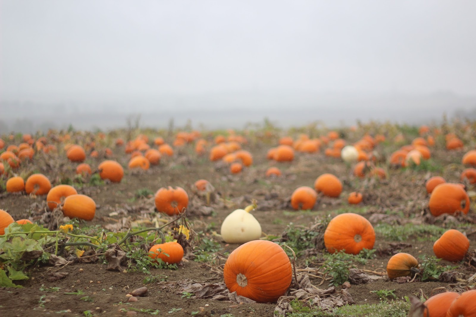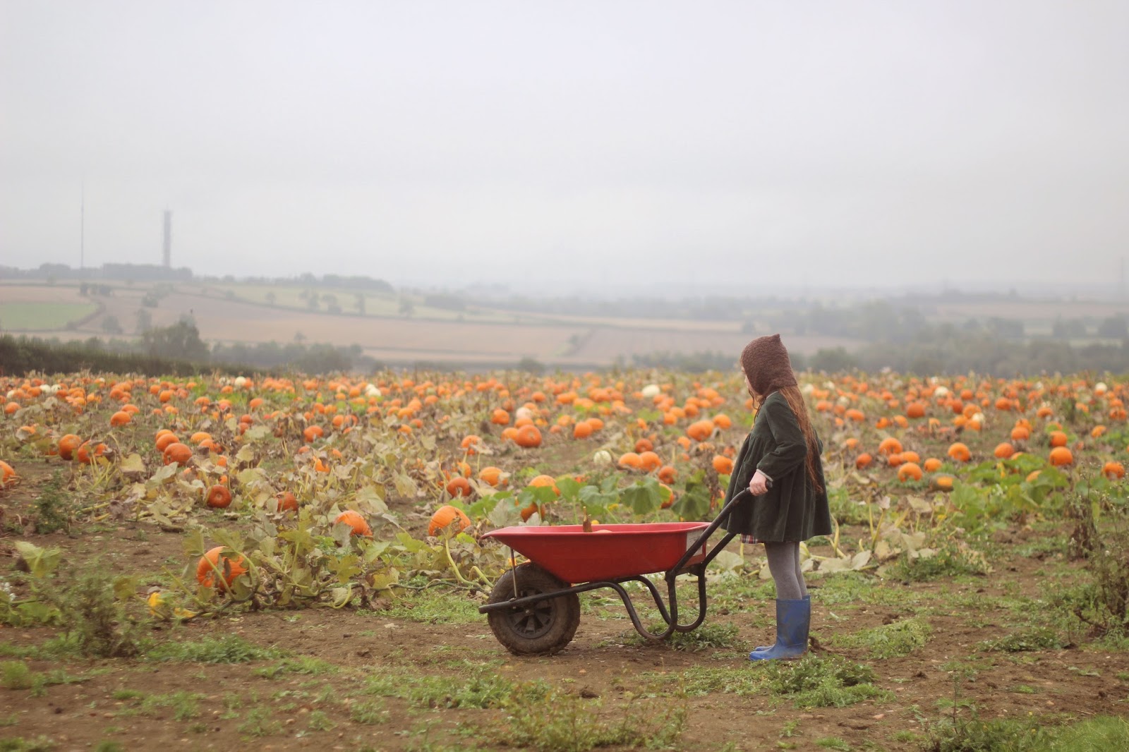 As we drove, the rain clouds came over and it started to pour. We reached the farm a just as it was opening and the rain was still pouring down. I was a little disappointed because i was so excited but it didn't really matter and the rain bought a beautiful mist which i was grateful for. I love an autumn morning mist. The only negative was that the pumpkin field had a clay soil so as soon as it got wet, it was super muddy and sticky. But, again, we didn't want anything to ruin this for us. It was our first experience at a pumpkin patch and i wanted the girls to have the best time. They both picked what they wanted and put them in the wheelbarrows. We were the only ones in the field and i could see the mist rolling over the hills. It was quite lovely actually.